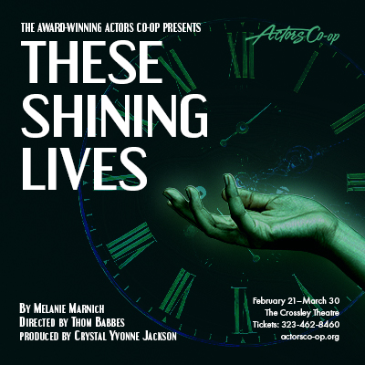 These Shining Lives runs through March 30 at the Actors Co-op’s Crossley Theatre, 1760 N. Gower Street, on the campus of First Presbyterian Church of Hollywood. Performances are Fridays and Saturdays at 7:30pm, Sundays at 2:30pm.There are Saturday matinees March 1 and March 15 at 2:30pm. Tickets are $32 and can be purchased here. Free parking is available at a lot across from the complex.