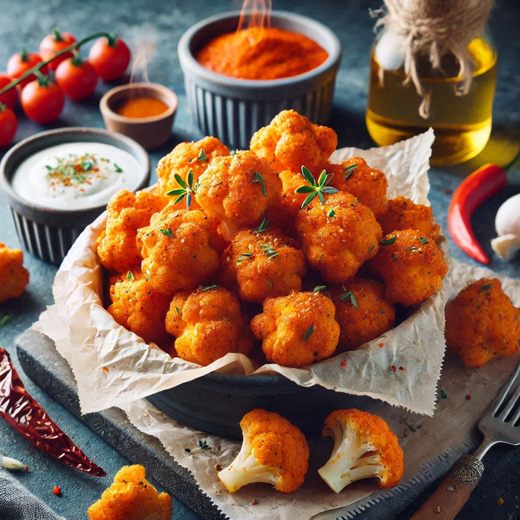 - Toss the crispy cauliflower bites in buffalo sauce and serve with your favorite dipping sauce.