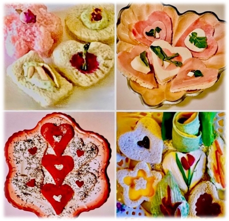 Sweet salty colorful delicious meals sandwhiches cakes petit fours and an exquisite rose dessert.