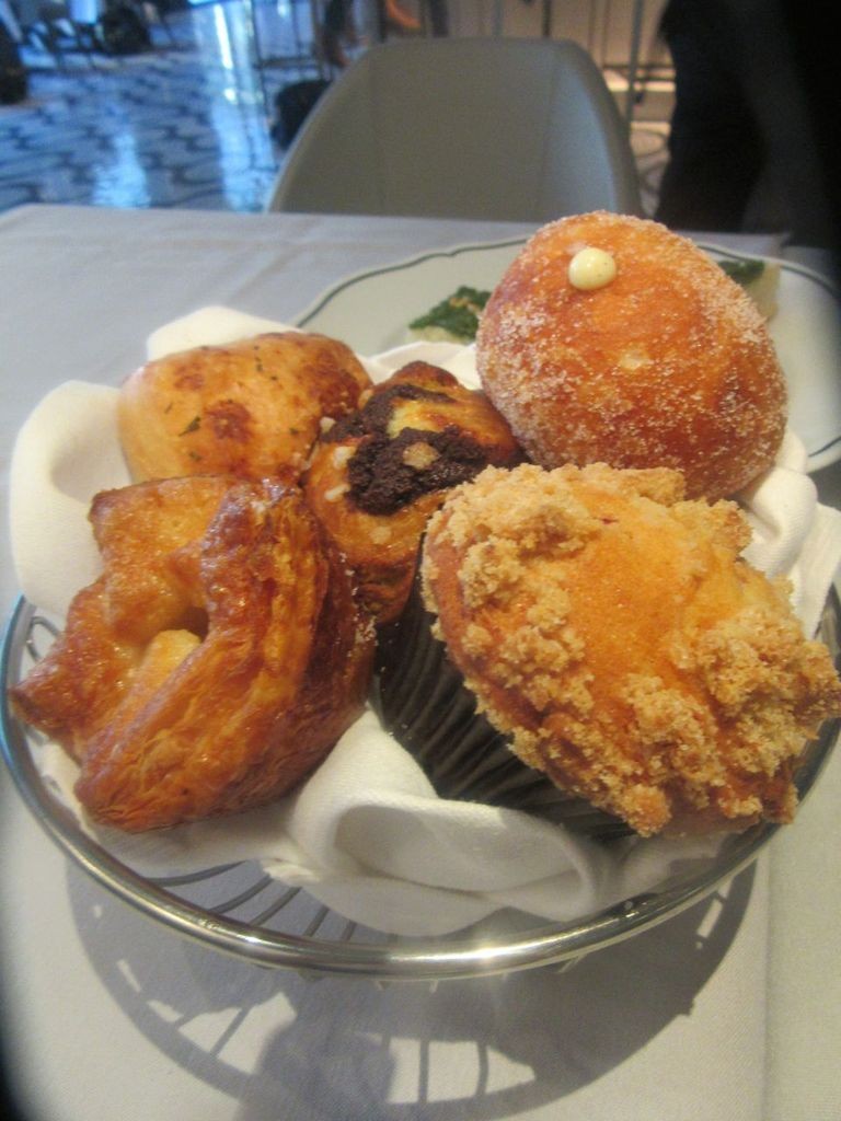 Nothing’s wrong with the pesto bruschetta – well, maybe it would be better for lunch. But I’m instantly distracted by the mixed pastry basket –“Five Pieces of our Best,” promises the menu. Yes. Yes. Yes. Muffins, an Italian donut, puff pastry — each one is different, which means I have to taste every one. With the house’s special butter in a doll’s house dish alongside. Yes, that too.