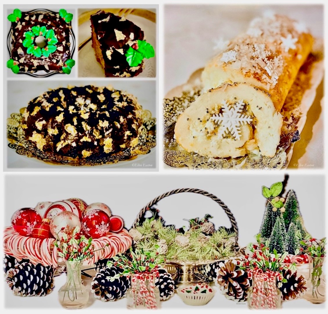 A festive tablescape sets the mood for the holidays. Yours can be as simple as a bowl filled with candy canes or an elaborate tableau. When it’s time for dessert, I am partial to mocha cake and cake logs in any size, flavor or season. A delicious, sweet course that can be made to complement and enhance any menu. For easy assembly I prefer angel food or sponge cake batter. From scratch is always extra special but a good box mix can be doctored to taste sensational too. Each will lend itself to add decorations and different fillings. It’s only a matter of personal preferences.