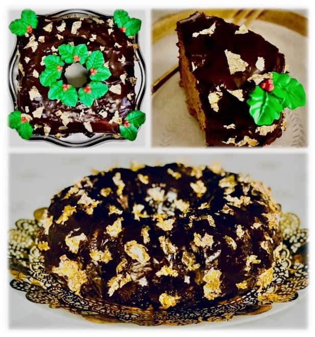 When cake is cool, remove from the pan/pans. With a warmed flat knife, ice the cake with the dark chocolate glaze. Decorate with edible gold, sugar decorations or a design of your choice.