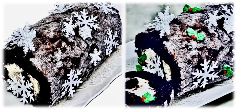 For this holiday season I am featuring a mocha cake, coconut angel food cream log made from a “doctored” mix and my mother, Reva Paul’s traditional chocolate sponge cake with cocoa whipped cream log made from scratch. Alternate fillings and decor may be substituted.